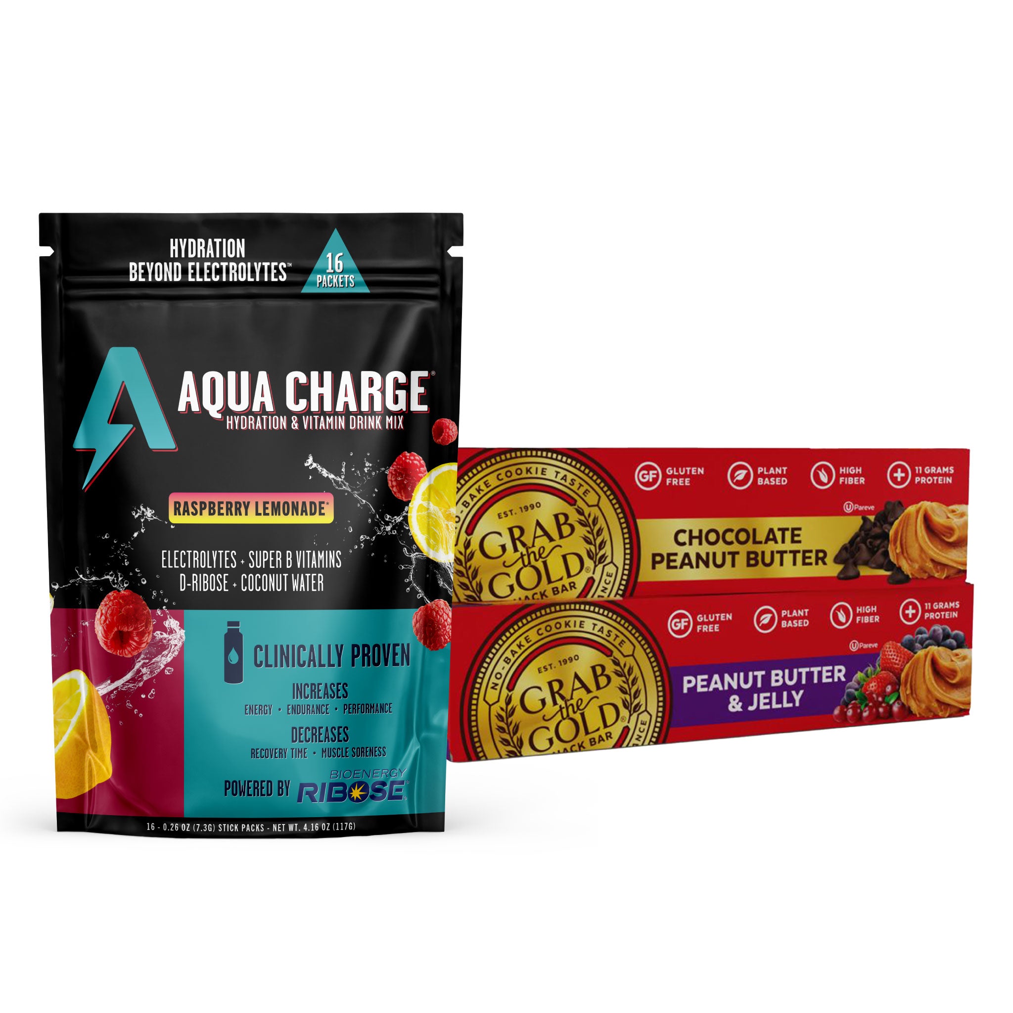 Do you always feel like you're fighting to get more energy throughout the day, or are you always hitting afternoon slumps? Imagine a day of constant energy, your cravings satisfied, and feeling like you've just won the day. The Monthly Must-Haves Bundle includes 24 protein-packed snack bars and a 30-day supply of our one-of-a-kind energy & hydration drink mix, Aqua Charge™, so you can Grab The Gold.